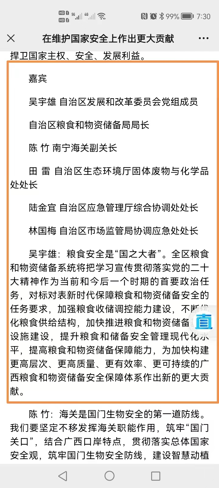 广西日报2022-10-22 005版 刊登《广西各界认真学习二十大报告和习近平在广西代表团的重要讲话精神》稿件,有吴宇雄局长作为嘉宾谈在维护国家安全上作出更大贡献的体会