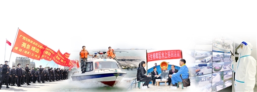 左一:自治区公安厅开展打击偷越国(边)境犯罪专项行动。宋延康/摄 左二:东兴市海上守碑护边党支部的党员护边员在海上边界巡逻。本报记者 何学俏 通讯员 谭海东/摄 右二:隆林各族自治县法院水上巡回法庭在渔船上开庭。百色市中院供图 右一:凭祥友谊关海关关员运用智慧物流管控平台监控园区车辆。 刘滨滨/摄