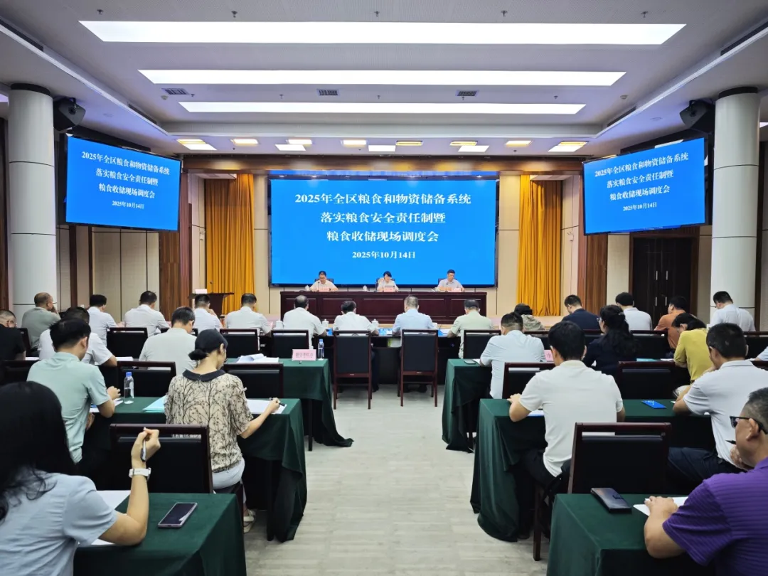 10月14日,自治区粮食和物资储备局在贵港市召开全区粮食和物资储备系统落实粮食安全责任制暨粮食收储现场调度会议,全面总结2024年度粮食安全责任制落实情况,分析调度2025年粮食安全责任制落实、粮食收储、购销和储备监管等情况,研究部署当前和今后一个时期工作。自治区发展改革委党组成员,一级巡视员,自治区粮食和物资储备局党组书记、局长许瑾出席会议并讲话。局党组成员、副局长甘志新主持会议并通报2024年度粮食安全责任制工作情况,局党组成员、副局长覃家权通报2025年粮食购销和储备监管情况。