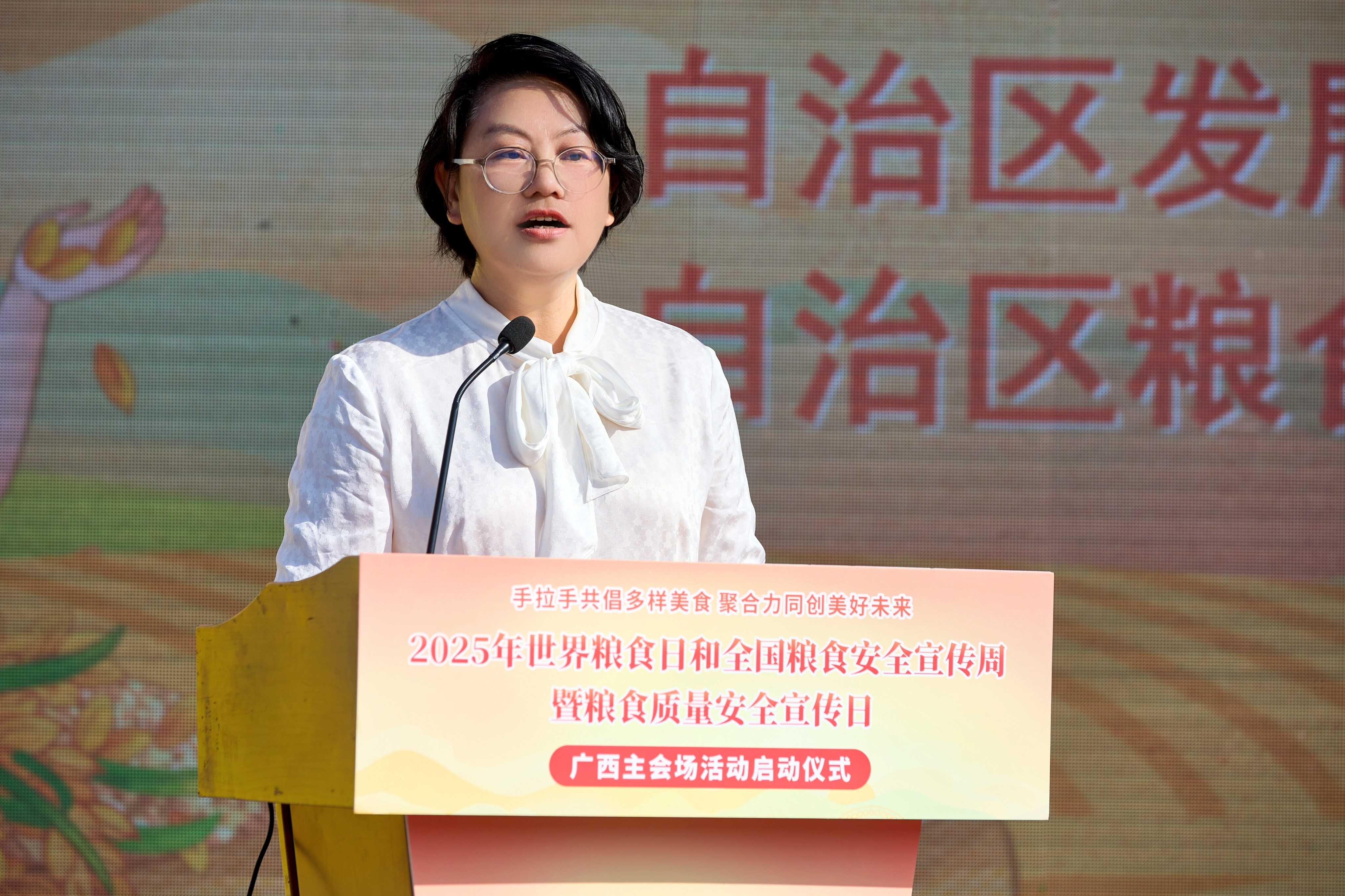 在致辞中,许瑾表示,此次活动主要目的是深入贯彻习近平总书记关于保障国家粮食安全的重要论述和关于广西工作论述的重要要求,全面贯彻《粮食安全保障法》,扎实推进国家粮食安全战略和乡村振兴战略,集中展示广西粮食工作的新进展、新成效,进一步增强全民粮食安全意识,推动全社会形成爱粮节粮、健康消费的良好风尚。许瑾指出,近年来,在自治区党委、政府的坚强领导下,全区粮储系统戮力同心、加压奋进,坚决守住管好“八桂粮仓”和“大国储备”,全面落实粮食安全党政同责,重塑法治建设、体制机制和工作流程三个“四梁八柱”,努力交出让党和人民满意的答卷。全力推进《广西壮族自治区粮食安全保障条例》立法,全链条织密粮食安全“法治防护网”;深化粮食购销和储备管理体制改革,推进国有粮食企业转型,构建“权责明确、协同联动、规范有力、廉洁高效”的监管新模式;超额完成国家下达的新增储备规模,连续22年稳定实施稻谷补贴政策,每年核发售粮补贴3亿元,研发应用“桂粮通”售粮预约小程序,提高农民售粮效率,有力保护种粮农民积极性;以“优种、优植、优管、优收、优储、优销”“六优”建设国家储备粮源基地,推动“广西香米”三度荣获“中国粮油影响力公共品牌”;实施粮食绿色仓储提升行动,推广应用绿色储粮技术,粮食储存环节综合损耗率控制在0.6%,低于全国平均水平;开展央地协作,多部门联合执法,打好粮食流通监管“组合拳”,2024年以来收储粮食质量合格率达100%,彻底整治粮食质量问题多发的历史难题,坚决守护人民群众“舌尖上的安全”;压紧全面从严治党责任,高质量建设“清廉粮仓”,干部职工抢抓落实、担当实干蔚然成风。全区粮食和物资储备事业呈现新气象,粮食和物资储备安全根基更加牢固。许瑾倡议,各级政府、粮食企业、人民群众和媒体朋友共同行动,携手做粮食安全的守护者、践行者,让爱粮节粮深入人心。
