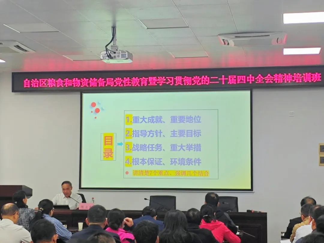 培训班为期四天,邀请自治区政协文化文史和学习委员会副主任委员陈立生,以及自治区党委党校、自治区党委区直机关工委等单位的专家教授进行专题授课。课程紧扣习近平总书记在党的二十届四中全会上的重要讲话精神和全会审议通过的《中共中央关于制定国民经济和社会发展第十五个五年规划的建议》,从全会的重大历史意义、核心要义和实践要求三个维度,系统阐释全会精神的丰富内涵。深入解读习近平总书记关于党的作风建设的重要论述、基层党组织建设和党风廉政建设等内容。通过系统讲解和案例剖析,引导广大干部深刻理解、准确把握新时代新征程党和国家事业发展的战略部署,助力学员开拓视野,提高政治觉悟,提升全区粮食和物资储备党员干部的综合能力。