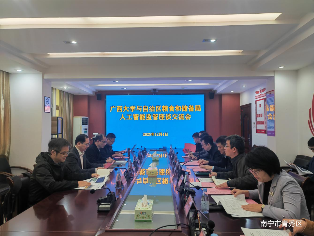 12月4日,自治区粮食和物资储备局与广西大学召开人工智能监管座谈交流会。自治区粮食和物资储备局党组成员、副局长覃家权主持会议,广西大学电气工程学院党委副书记、副院长张镱议教授率队参加。