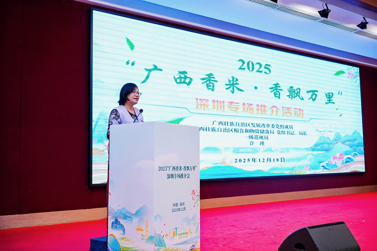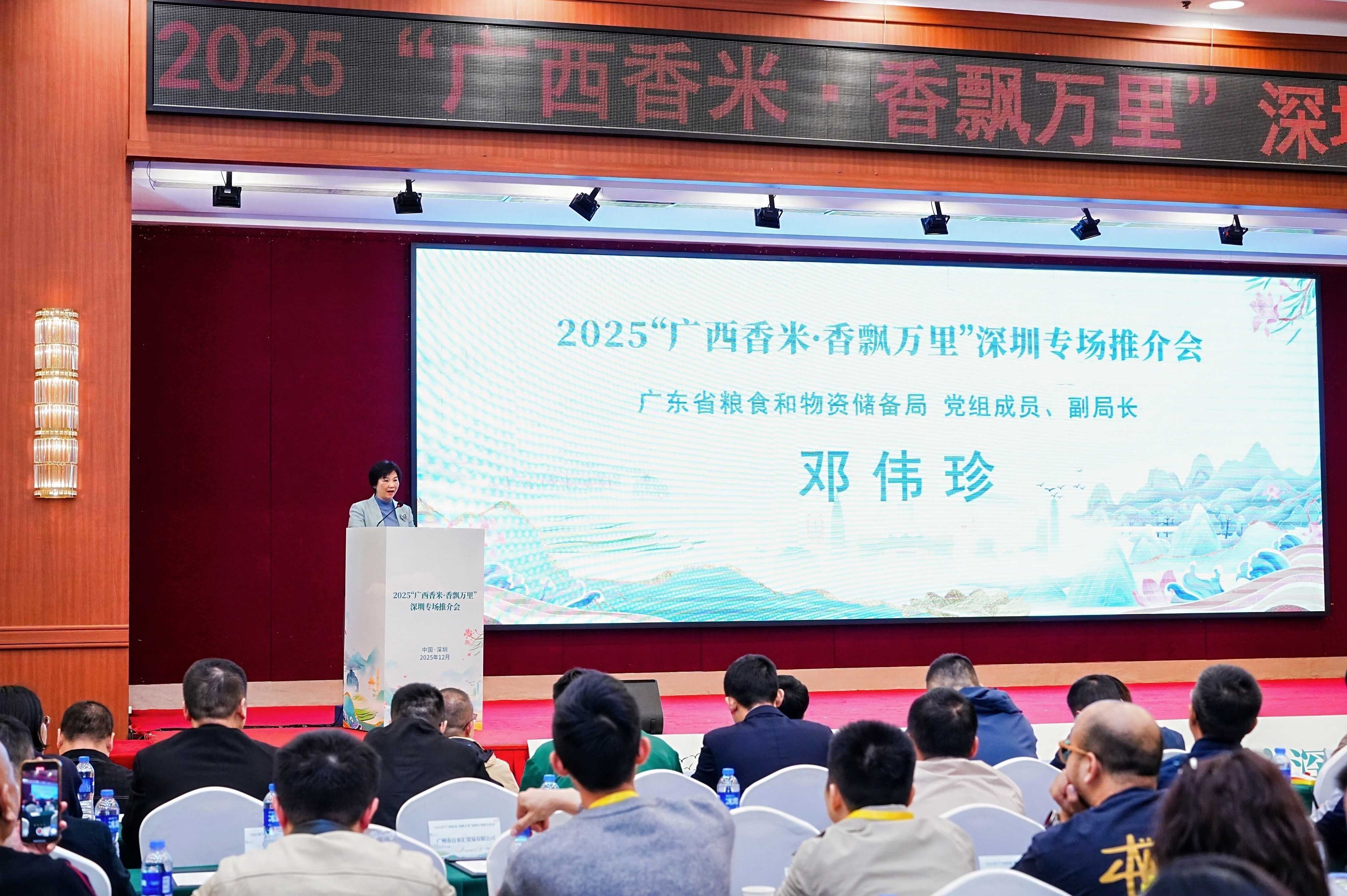 12月18日,由广西壮族自治区粮食和物资储备局、广东省粮食和物资储备局、深圳市发展和改革委员会共同主办的2025“广西香米·香飘万里”深圳专场推介会在深圳市成功举办。广西壮族自治区发展和改革委员会党组成员,自治区粮食和物资储备局党组书记、局长、一级巡视员许瑾,广东省粮食和物资储备局党组成员、副局长邓伟珍出席活动并致辞。