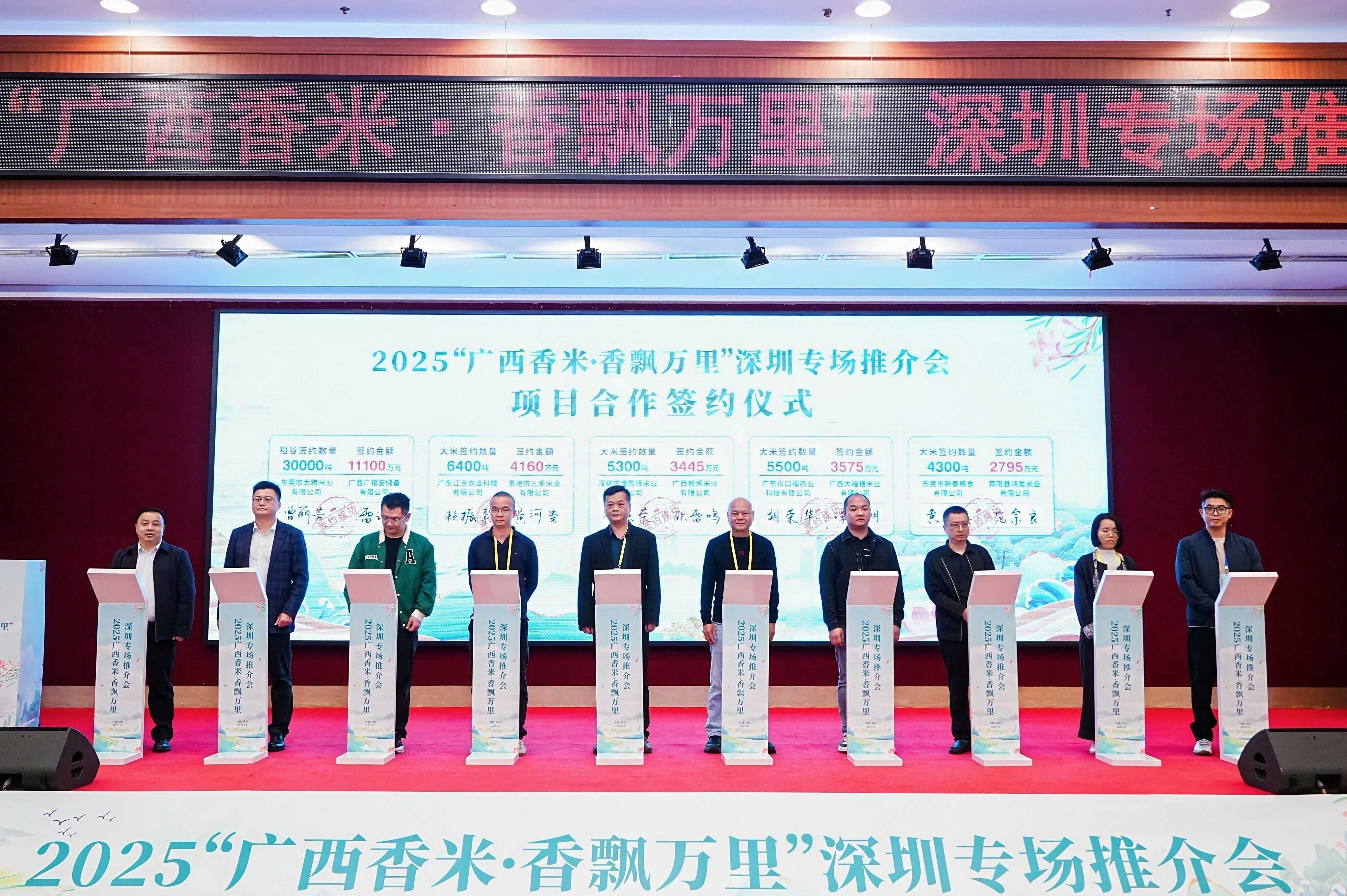 本次推介会不仅是品牌形象的集中展示,更是一次产业资源的精准对接,标志着“桂粮粤销”产销对接工作迈出坚实步伐,为后续深入合作奠定了坚实基础。活动吸引了粤桂两省区百余家企业的140余名代表齐聚一堂、共谋合作,20家企业现场签订广西香米购销合同总量达7.91万吨,意向签约金额达4.3亿元。
