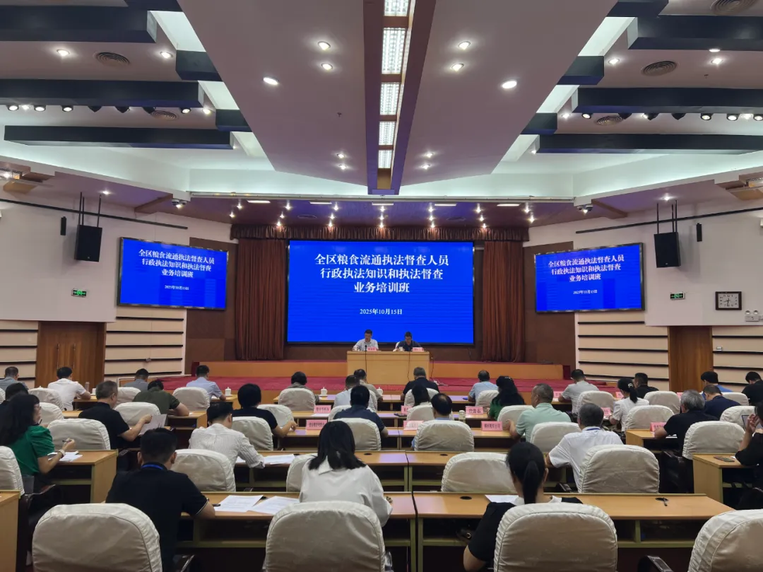 2025年10月15日,自治区粮食和物资储备局在贵港市举办全区粮食流通执法督查人员行政执法知识和执法督查业务培训班
