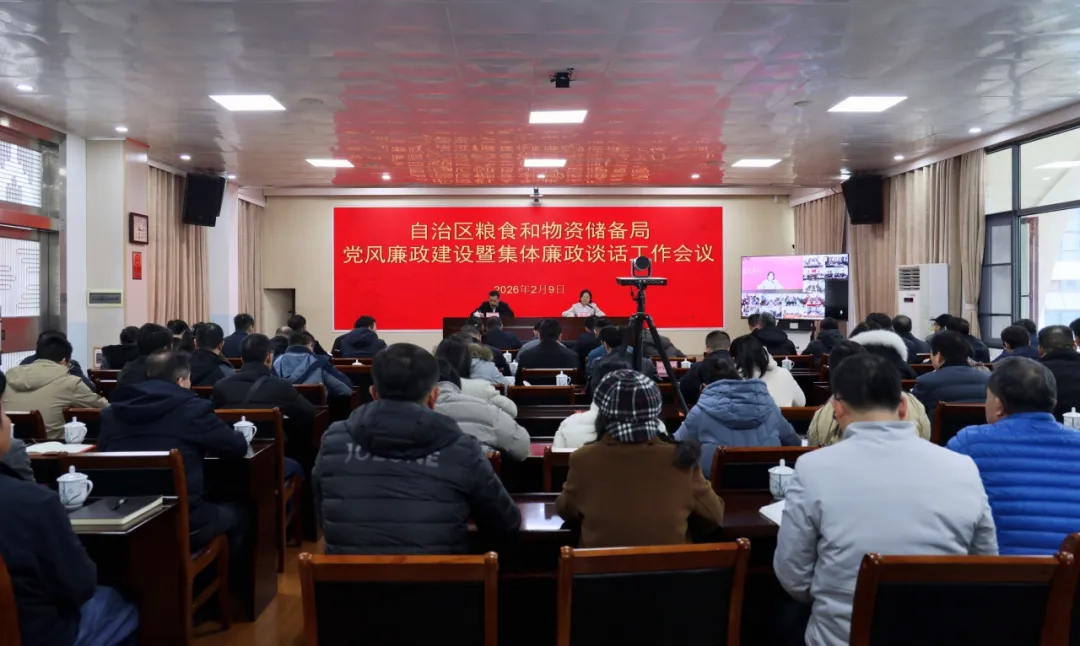 2月9日下午,自治区粮食和物资储备局召开党风廉政建设暨集体廉政谈话工作会议,深入学习贯彻习近平总书记在二十届中央纪委五次全会上的重要讲话精神,贯彻落实自治区纪委十二届六次全会精神,全面总结2025年全局党风廉政建设工作,研判全面从严治党形势,部署2026年重点任务。自治区发展和改革委员会党组成员,自治区粮食和物资储备局党组书记、局长、一级巡视员许瑾同志主持会议并讲话;自治区发展改革委党组成员、自治区纪委监委驻自治区发展改革委纪检监察组组长梁植诚同志到会指导并提出工作要求。